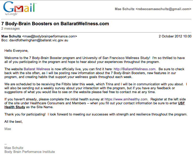 In January of 2011, the City of Ballarat, Australia implemented an employee wellness program that included the services of other third party wellness initiatives such as QUIT (smoking), Weight Watchers, and a 10,000 steps challenge. It also included a 2 hour lecture by Professor Paul Taylor about wellness and motivation as well as a chance to participate in an 8-week wellness program I created using content produced by Paul Taylor. The program was used to measure how online and social engagement promoted lifestyle behaviors that lead to improved physical and mental health in this study through the creation of a website, email campaign, and FitBit activity monitoring devices.