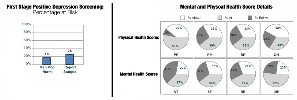 The Physical Health scores are at or slightly above the Norm sample. However, the Mental Health scores are all slightly below the Norm sample. Although the Composite Mental Health Score was only slightly below the Norm sample, it was alarming to see how many of the subjects had a lower Mental Health Score, and the percentage of those who were positive for the first stage of depression.