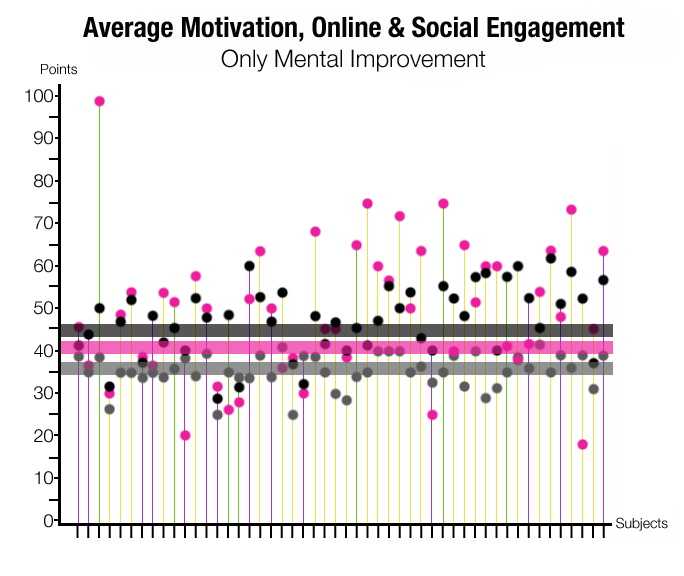 It is interesting to note that the two subjects with a significant mental improvement were very different in their scores. One had slightly below average online and motivation scores. The other had an above average online and motivation. Both had below average social scores.
