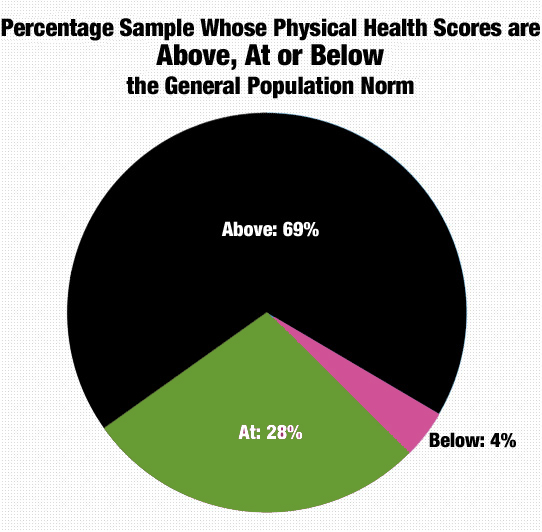 The initial SF36v2 Health Survey showed the 108 subjects to have a General Health (physical) score of 50.48, and a Mental Health score of 48.79, with a General Population Norm of 50 for both. For more about how the General Population Norm and Health Scores are determined, see Appendix .