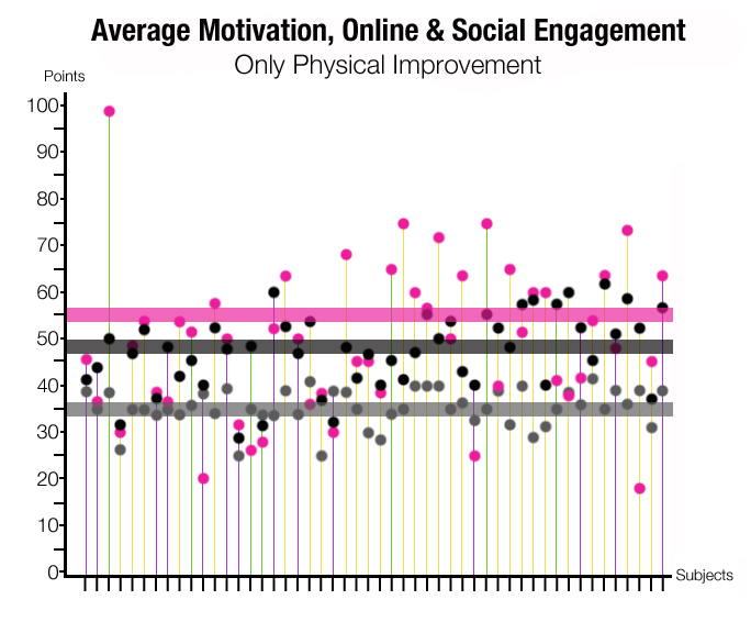 The shaded lines show the average Motivation, Online & Social Engagement of subjects who had improved only their Physical Health in the program.