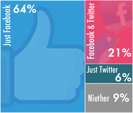 62 of the 106 (or 58%) of the study subjects answered the question. As you can see from infographic, 64% of those who answered used only Facebook, where only 6% just used Twitter, and 21% used Twitter and Facebook.